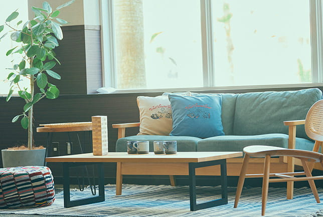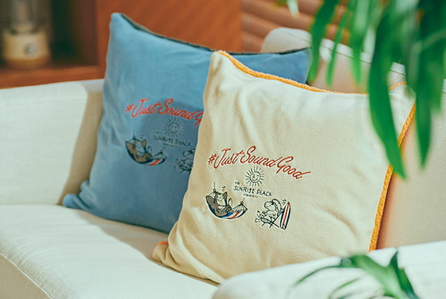 奇抜な色使いが印象的なクッションは、
